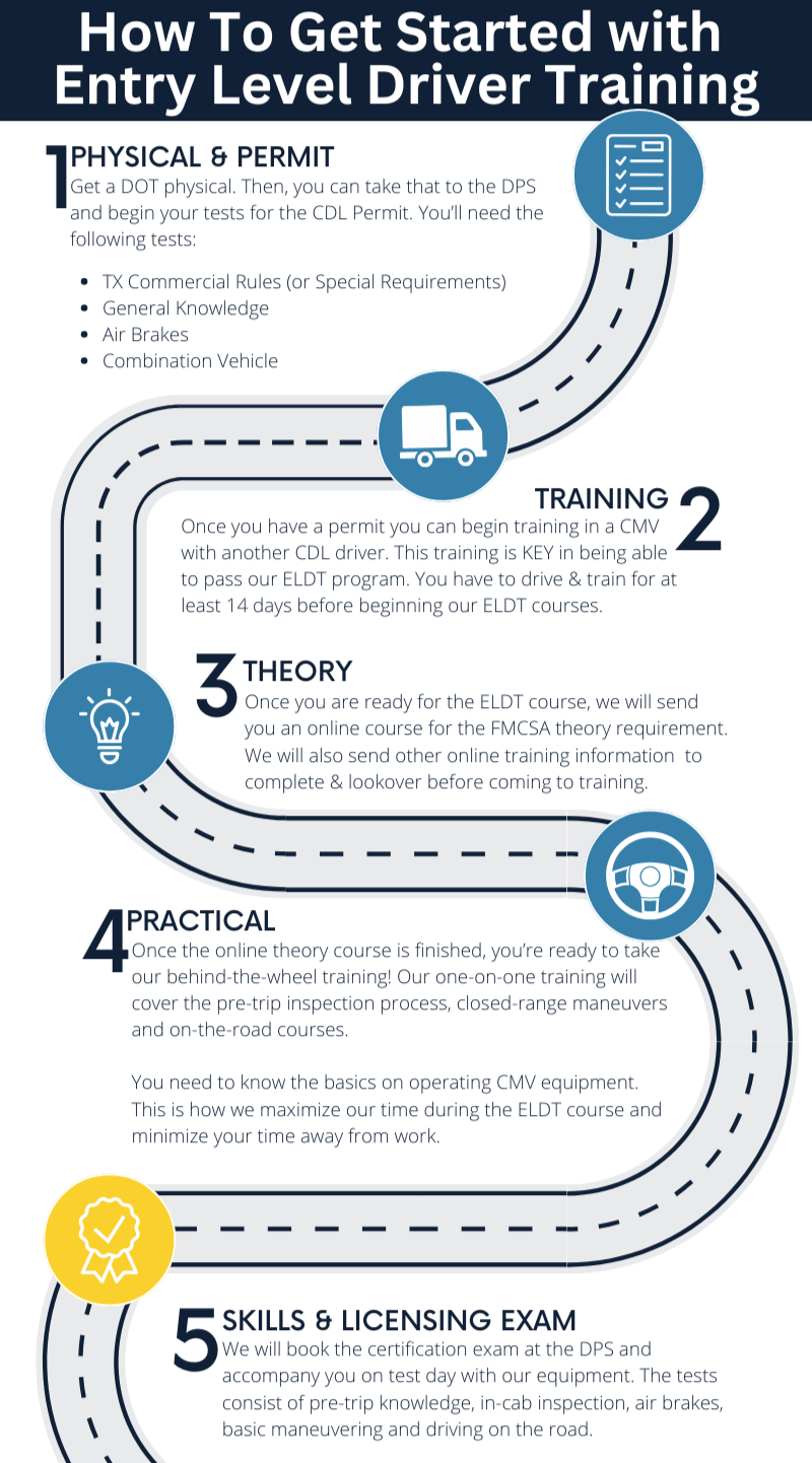 • When you apply for your CDL, you must obtain and hold a Commercial Driver License Permit and hold it for at least 14 days, before applying for an ELDT class.